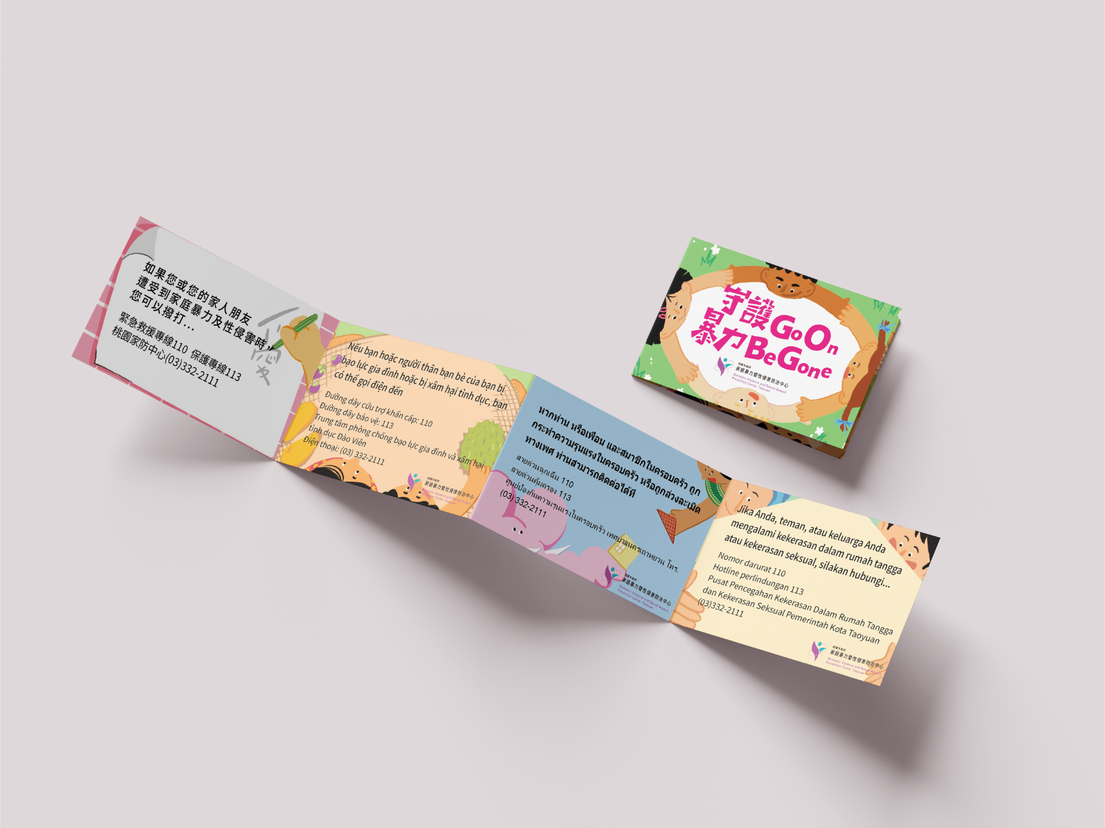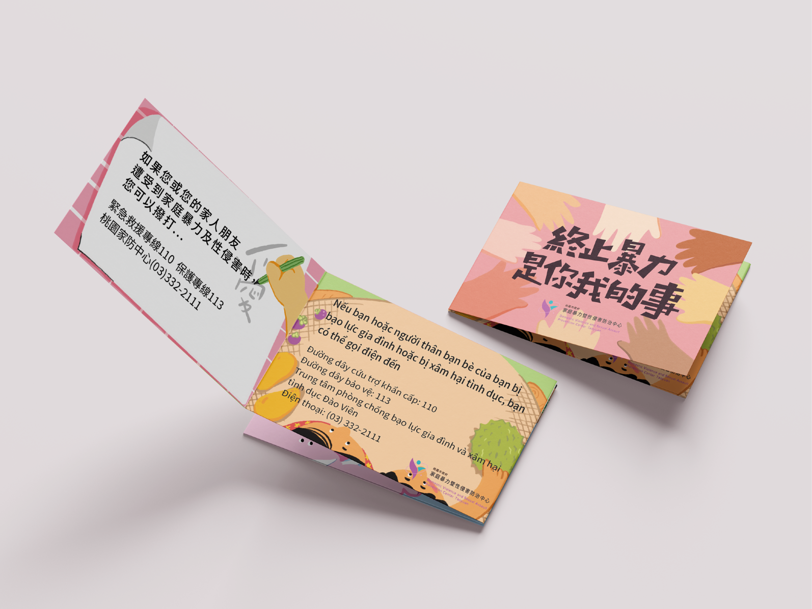 本案為桃園市家庭暴力暨性侵害防治中心製作的名片尺寸折頁小卡,旨在提供民眾於危機時能立即取得求助資訊。由於桃園外籍人口比例高,小卡以多國語言(中文、英文、日文、泰語、越南語、印度語)呈現,讓不同文化背景的使用者都能在最短時間理解訊息。